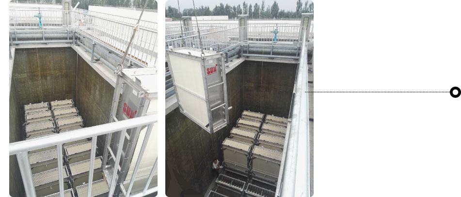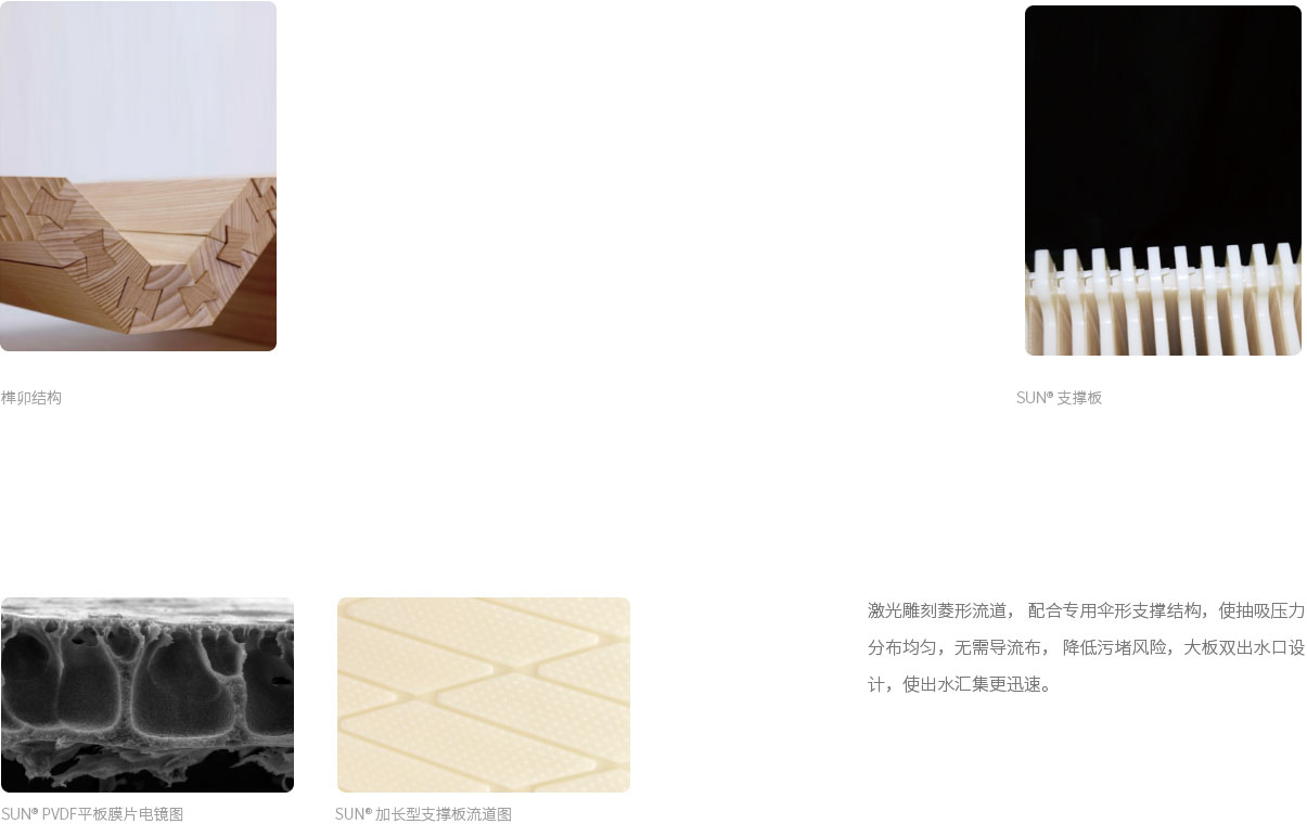 SUN?的平板膜采用PVDF材料,其擁有更好的化學(xué)穩(wěn)定性、抗污染性和機(jī)械強(qiáng)度。公 司采用先進(jìn)的制膜工藝,控制膜孔徑在 0.1um,并且有更高的產(chǎn)水通量和出水 水質(zhì)。板子采 用榫卯配合,膜片間距更穩(wěn)定,無需側(cè)裝板。膜片安裝時(shí),可從頂部向下安裝,也可從側(cè)部 安裝,不受施工現(xiàn)場(chǎng)條件限制。